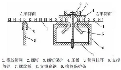 (1)大多的篩分設備制造廠,在制造篩子時,為了提高有效篩分面積,都把篩網的支撐梁設計成一根側立的鋼板,再在鋼板上壓一塊或襯一塊橡膠保護條(如圖1所示)。由于支撐梁太小,所以上面沒法再加裝壓板。