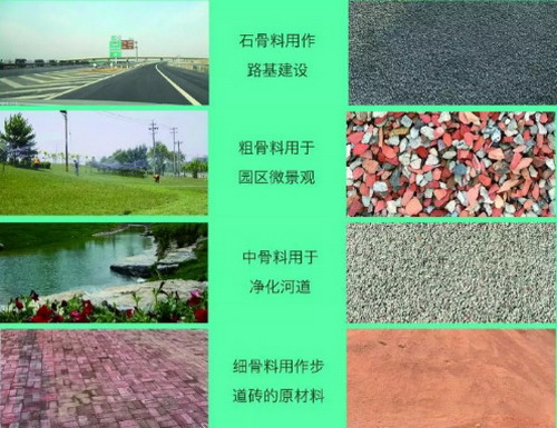 顆粒較大的粗骨料搖身一變,用做公路路基和公園內的微型景觀,中骨料用以河道水質凈化,細骨料則成為步道磚或樓房的基礎回填。